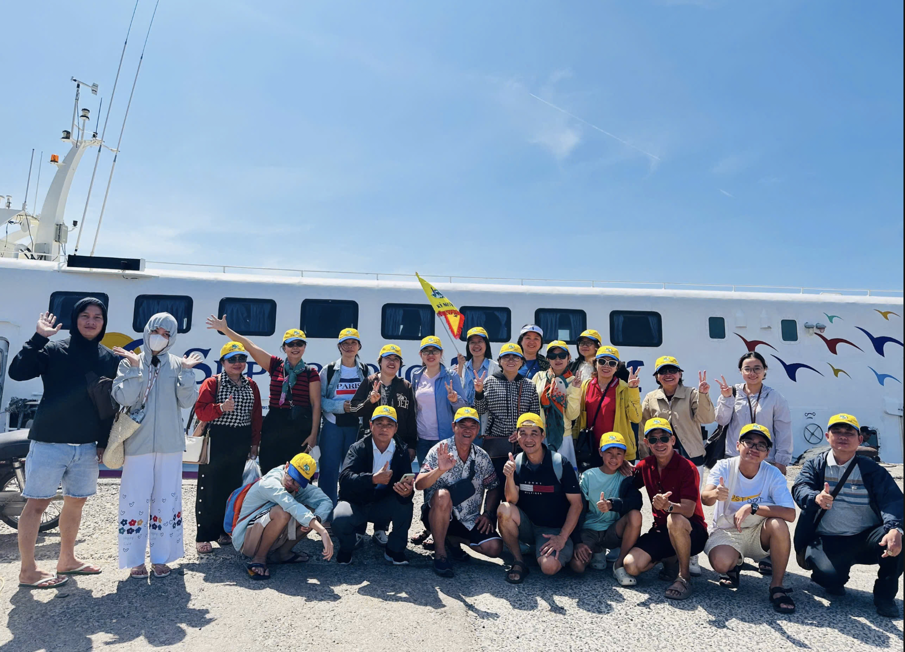 - Đoàn chuẩn bị đồ tắm di chuyển bằng xe máy để ra bến tàu. Bắt đầu chương trình tham quan bằng tàu
