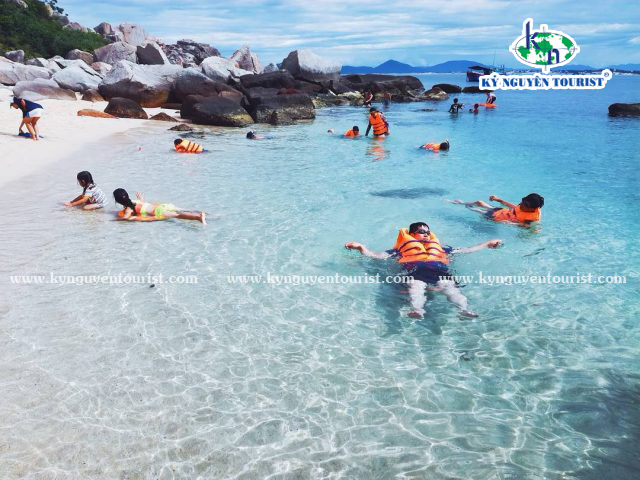 Buổi sáng: Đến Bãi Kinh, Quý khách lên tàu di chuyển tham quan, quý khách sẽ được tận mắt ngắm nhìn những rặng san hô tuyệt đẹp đủ màu sắc trong lòng đại dương của Bãi Lớn. Tắm biển thoả thích, vùng vẫy trong làn nước trong xanh của Bãi Chuối hoặc Bãi Me.