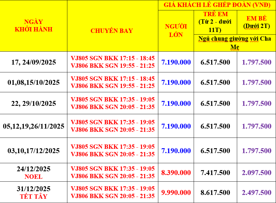 - Vé máy bay khứ hồi theo SGN-BKK-SGN (bao gồm hành lý ký gửi và xách tay).