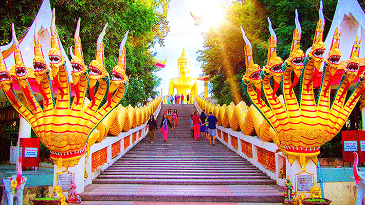 - Tiếp tục tham quan “Trân Bảo Phật Sơn” hay còn gọi là Khao Chee Chan, nơi được tạo nên nhân dịp kỷ niệm 50 năm đăng cơ của nhà vua Thái Lan. Là một ngọn núi đẹp nổi tiếng nằm ở tỉnh Chon Buri, cách Pattaya – thiên đường biển đảo Thái Lan chỉ khoảng 15 km, Nổi bật giữa thiên nhiên hùng vĩ và vẻ đẹp hoang sơ của thiên nhiên là bức tượng nổi Thích Ca Mâu Ni Phật đang ngồi tọa thiền được tạc trên vách núi cao, Bức tượng cao đến hơn 100 mét, rộng khoảng 70 mét, được đúc nổi hoàn toàn bằng vàng ròng 24 cara, được tiến hành xây dựng vào năm 1996 nhân dịp Quốc vương Rama IX trị vì vương quốc Thái Lan được 50 năm.